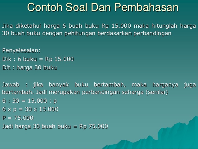 Perbandingan adalah membandingkan dua nilai atau lebih dai suatu besaran yang sejenis dan dinyatakan dengan cara sederhana.