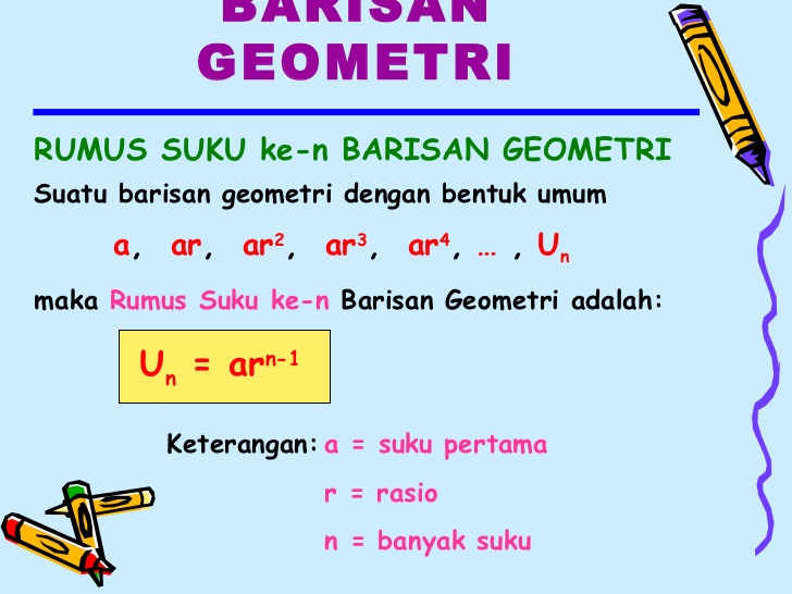 Deret Geometri adalah deret dengan rasio antar 2 suku yang berurutan selalu tetap.